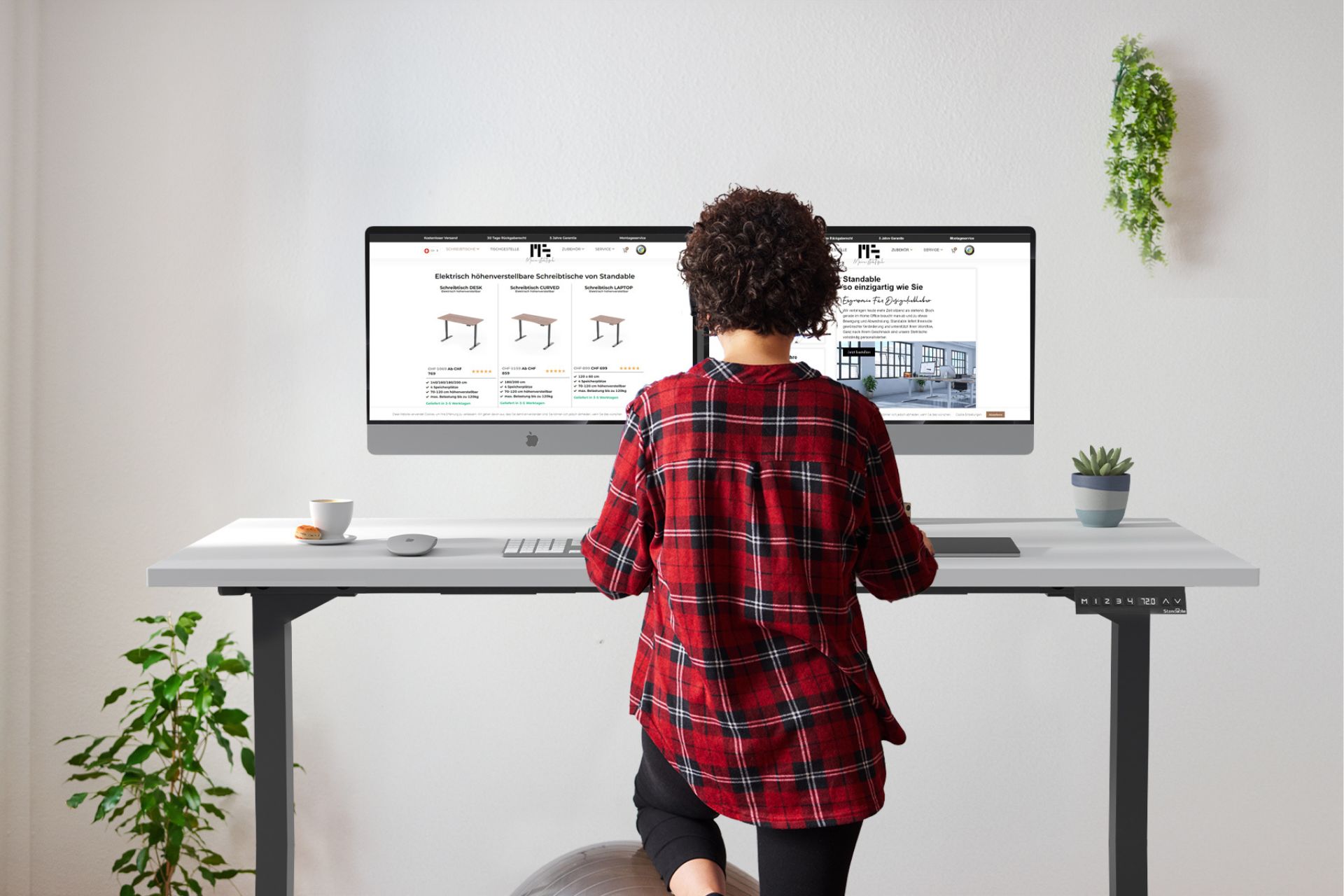 Frau steht beim Arbeiten dank elektrisch höhenverstellbarem Schreibtisch
